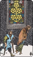 Five of Pentacles trong bộ bài Tarot Rider-Waite miêu tả một cảnh tượng đầy xúc cảm. Trên nền tuyết trắng, có hai con người nghèo khổ đang lầm lũi bước đi giữa đêm đông giá rét. Bộ đồ họ mặc dường như quá mỏng manh, làm sao có thể chống chọi được với cái lạnh cắt da cắt thịt này!