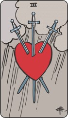 Lá bài này đại diện cho sự chối bỏ, nỗi đau, tan vỡ, sự cô đơn, chia cách và phản bội. Trái tim nhỏ bé của Three of Swords đã trải qua vô vàn tổn thương. Bạn đã hoặc đang gặp phải một thời kỳ khó khăn khi mà những mối quan hệ, suy nghĩ, hay thậm chí chỉ một lời nói hay sự thật nào đó gây ra cho bạn một vết thương lòng, đớn đau và dây dứt.